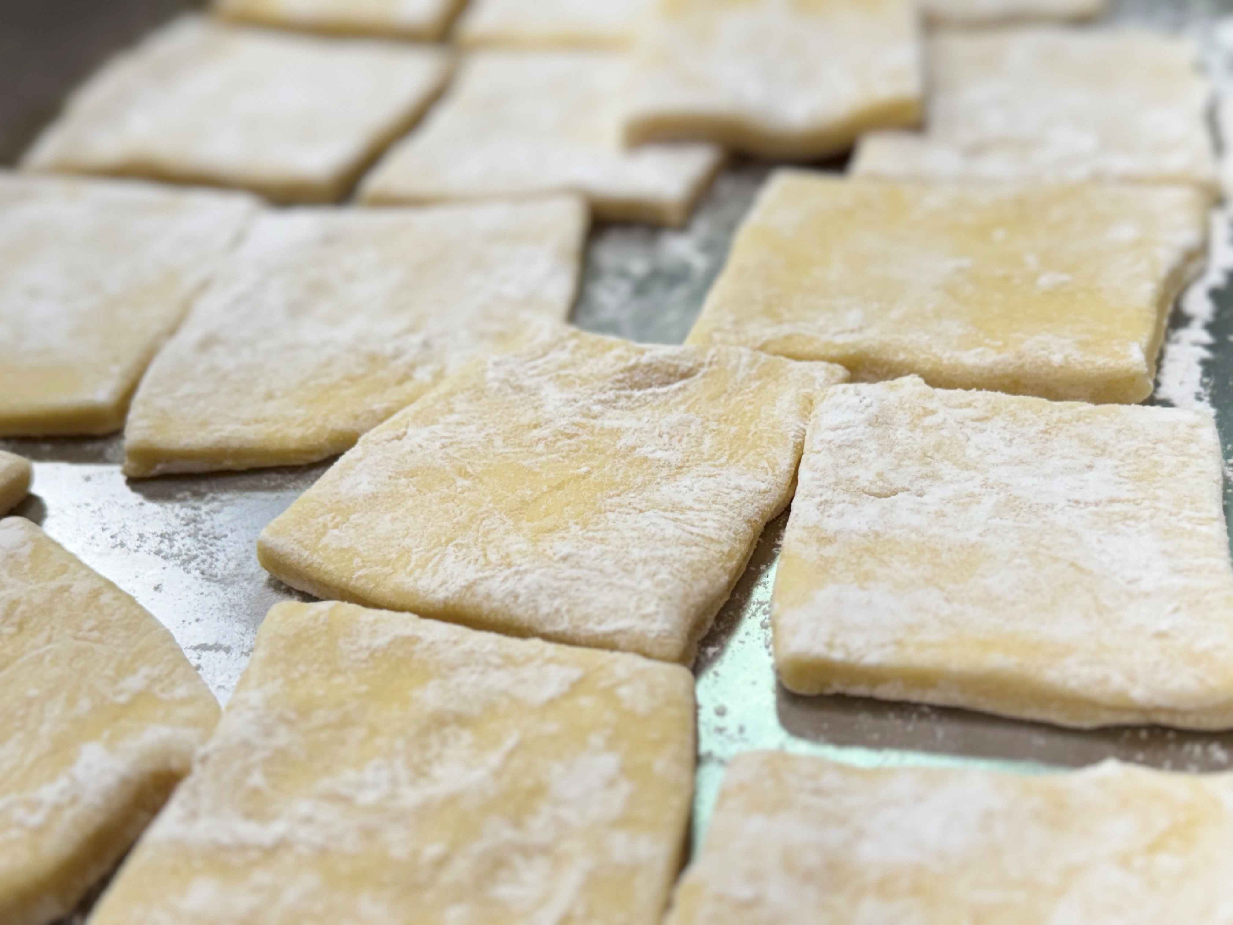 當麵糰發酵完成、切割成方塊後,油鍋開始加熱,滋滋作響的聲音像是在敲響開動的鐘聲。炸好的方餅膨脹成金黃色,外皮酥脆、內裡鬆軟,香氣撲鼻,現場響起一陣驚呼:「哇,好像雲朵一樣!」