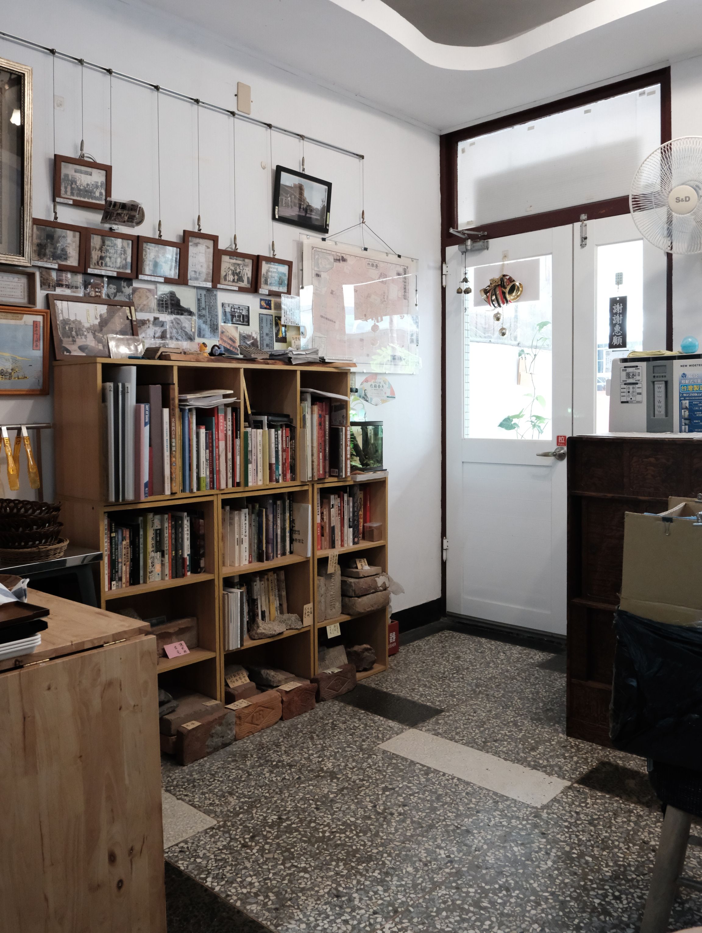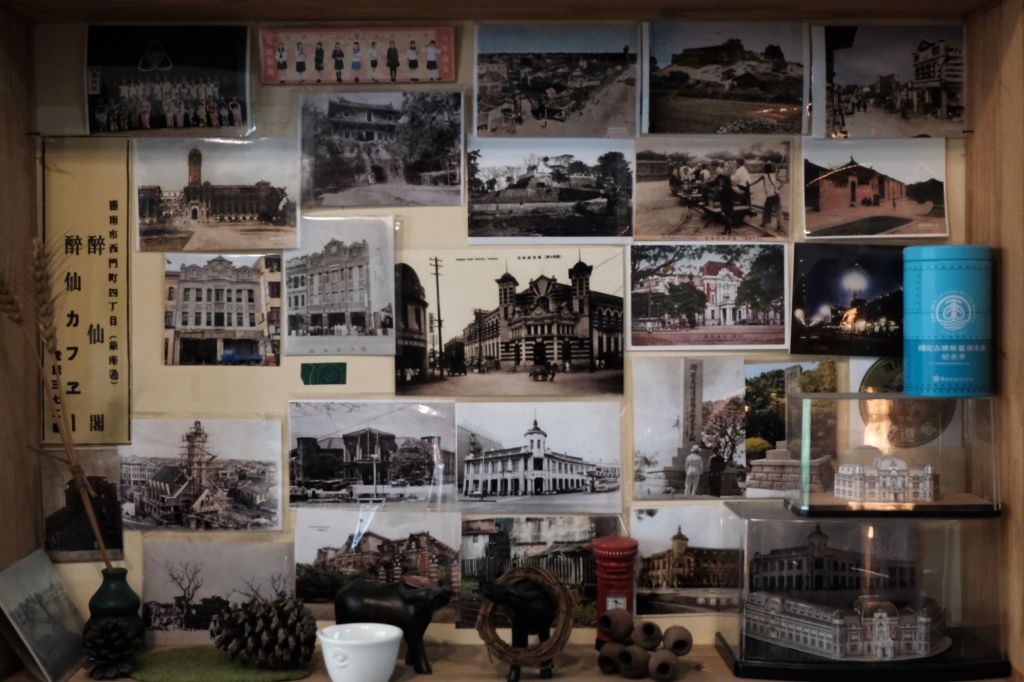 菜單之外,空間裡還擺著若干日治時期的車站紙雕、牆面掛著十數張黑白老照片、書櫃底鎮著或清代或日本殖民時期的磚瓦。一個不小心,就會忘記自己身處的地方是一處甜點店,而非一幢小藝文展覽館。