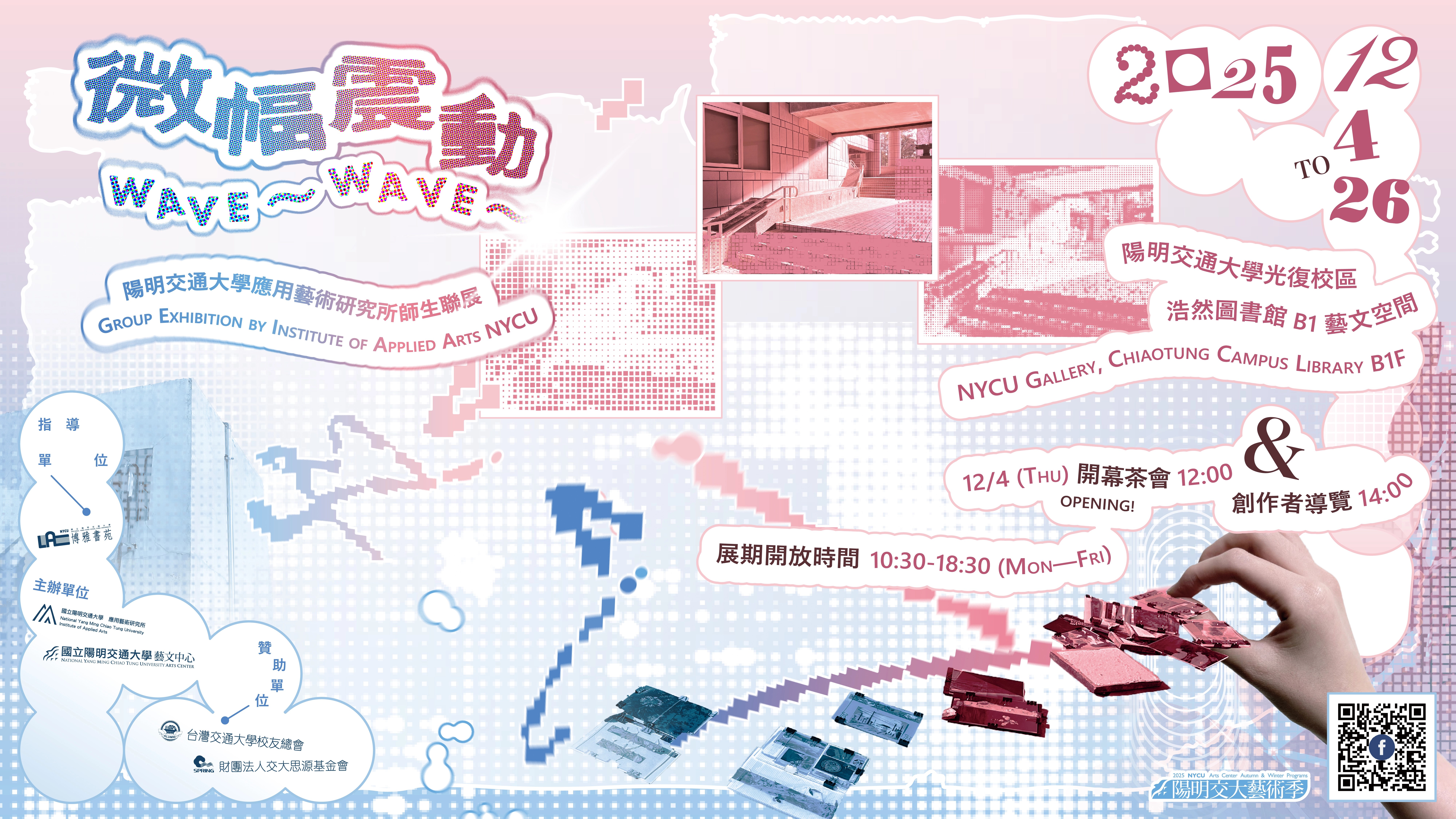 2025 陽明交大應用藝術研究所聯展《微幅震動》,於12/4至12/26在陽明交大光復校區藝文空間舉辦。本次聯展由應藝所兩位教師與十九位研究生共同參與,展出二十餘件跨領域作品。創作者以藝術回望並提問:活著意味著什麼?又如何在各異的媒材與語彙中,實踐屬於自己的生存命題,向來往師生輕輕投下一道道思索的波紋。 《微幅震動》聚焦於日常中那些細微而真實,幾乎被忽略卻無法抹滅的「震動」。
